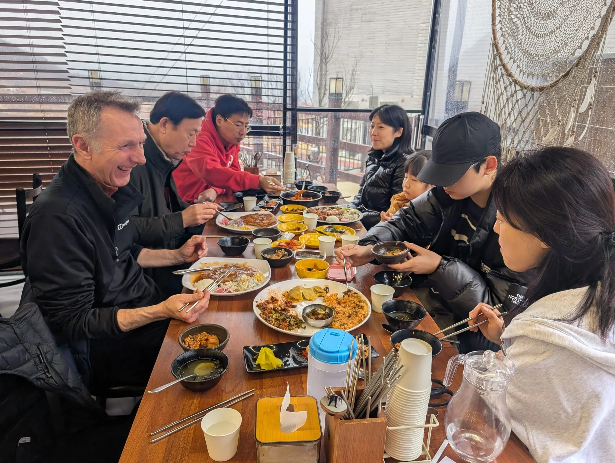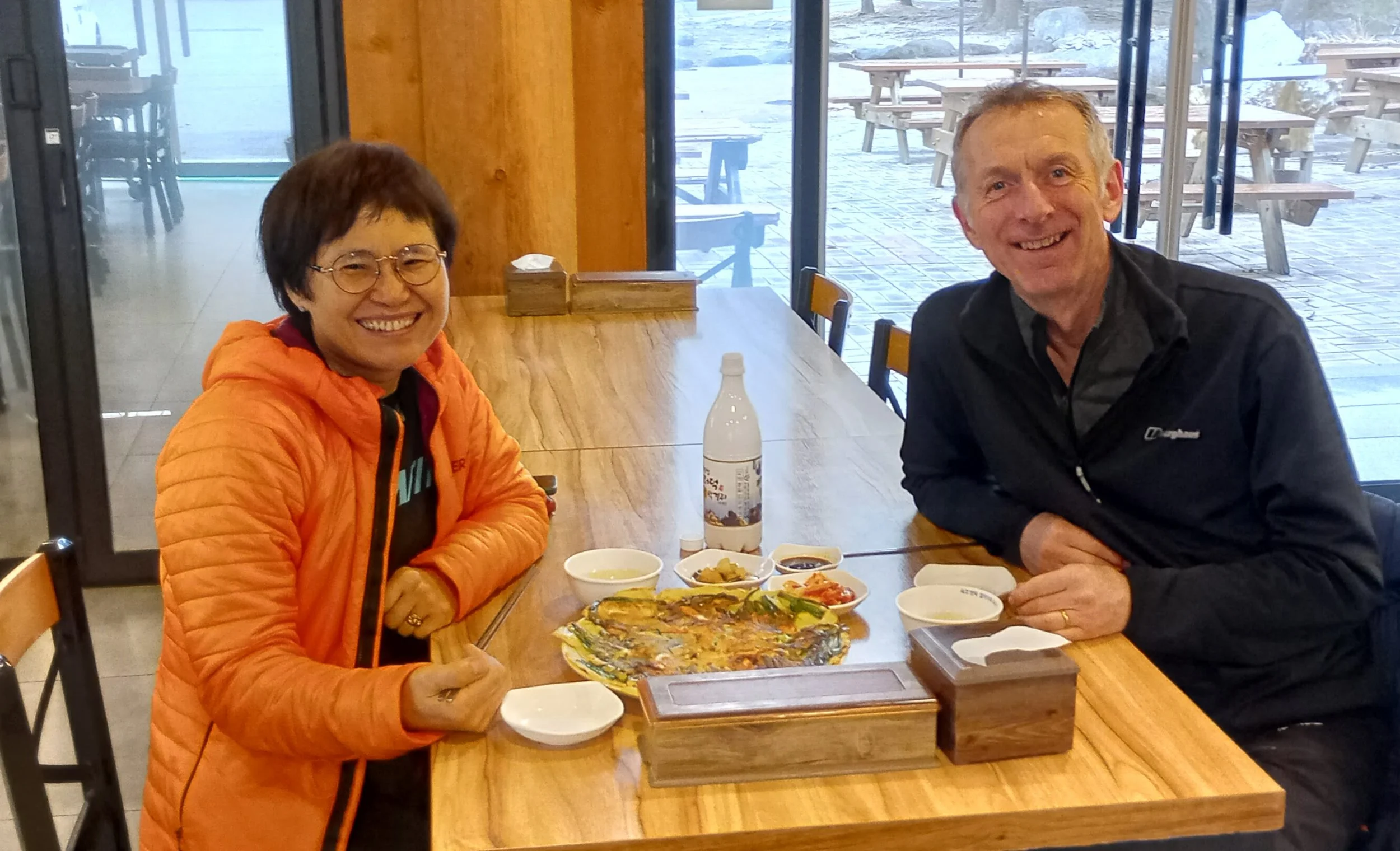 Over the next few days, Yim Soon had planned for us four nights in Seoraksan, the mountainous area in the East where we’ve had some special moments over the years. We were allowed one free buffet breakfast in the hotel where we were staying and amongst the array of stuff on offer there was a little ‘Western’ section. There’s a great picture we sent to our children which shows Yim Soon’s plate full of rice and vegetables and kimchi and the like, and mine with toast and bacon and eggs. Everyone was a winner! Another special meal for me in Seoraksan was the bowl of makgeolli (rice wine) and pancake ‘snack’ we had one day after a bracing walk in the mountains. It was special partly because of the memories it held for me. On that first visit to the country in ’92 we’d gone to the mountains and had met on the path one day a company president who was taking a month off to walk. Down in a restaurant at the foot of the trail he had treated a group of hikers, including us, to makgeolli and pancakes. Ever since then, I associate rice wine and pancakes with walking in the mountains in Korea but also with that act of kindness, as it has always inspired me to try to be generous to people in a similar situation.